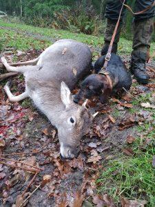 I had a welcome invitation to a friend’s hunting area recently, not far from home. I left in the very small hours with “Remy” my young Teckel and my rifle. Our plan was to have a few hours early morning stalking and hopefully also give “Remy” some further education with Deer. His initial live Deer work had been limited as he arrived as a very young puppy in October 2020, while he did accompany me here and there, it would really be the 2021 / 22 season where he would start to learn. We had a bit of a rocky start as day broke, with things not going as smooth as they should and the first few deer accidentally winding us, but luck soon caught up with us in the woods when I had all my work cut out to shoot a fine Fallow buck between many off putting trees and branches, I then shot a pricket on an adjoining laneway and sort of engineered a “track for “Remy” who took it all in his stride. It was a thoroughly enjoyable morning and provided a lovely animal for the freezer with everything else going to the Teckels and Lurchers or kept back for summer blood tracking training.