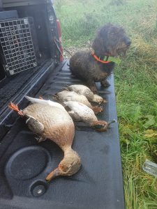 We had a cold snap just prior to and around Christmas and it was a great opportunity for me to take a wonder out with a couple of Teckels. “Cider” who unbelievably is now in her 5th year and “Remy” now in his third are a great little team and I set off late one morning not expecting much excitement at all. Within a few hundred yards of my house there are a few earths which we check now and again and with the frost I was hoping someone might be at home. I didn’t have to wait long as when we entered one field, “Remy” had his nose down along a fence line and began to run with “Cider” not far behind. By the time I reached them, “Cider” had slipped into a little earth under a tree and “Remy” was outside it whining being impatient. I slipped a lead on him and moved him back a little and could hear faint baying below. I stood back on the bank, reached into my pocket for two cartridges and a ginger ball exploded from under the tree – By the time I got myself together he was long gone and “Remy” almost took the fence with him up the field! He saw the fox bolting was doing cartwheels on the end of the lead, I had no choice but to let him off as “Cider” arrived at the mouth of the earth looking rather unimpressed with my lack of organisation. After 15 minutes or so “Remy” had not returned and a quick look on his tracking device showed him near a laneway on the far side of the river so it was a quick walk to retrieve him. We checked a few more earths along the river and had a bit of a rake about before the light started to fade and we made for home.