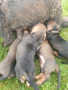 Back in September, my bitch Poppy whelped a fine litter of puppies – A long day resulting in a late trip to the vets to extract a stubborn dog pup who didn’t want to leave. I arrived with my vet “Anne” at around 6.45pm and she said “Poppy” would need a caesarean and she would get it done sharpish as the rugby was on at 8.00! Within no time at all, Anne had TWO puppies out and they were in good health as was Poppy when she came round and the entire litter of 7 did very well from the off. I had expected a slow start with “Poppy” having a section but within a few hours they were feeding well and now at 8 weeks old have been wrecking the entire place and enjoying some play time with the older Teckels. Puppies are all well and good but it is getting genuine, caring and sensible homes for them that is the difficult part. A few of “Poppys” whelps are off to the USA, a few are remaining in Ireland with one going to my good friend and long-time Teckel enthusiast “Drue” and one is off to my pal Daniel in England in a few days to work along side his birds of prey in the future and I know he will have a great life with him.