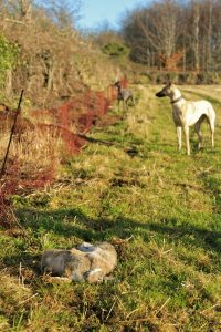 By now it was almost ten o’clock and the sun was getting well up, the frost dripping away and the two stubble ground we arrived on looked great in the sun. A large Ditch run up the middle for a couple of hundred yards and as I run out the net and looked at the spill from the holes and that familiar rabbit smell hung in the air I was hopeful for some better action here. I collared up 6 or so ferrets and the other lads did the same, the dogs hung well back and so did we and as the ferrets tasted the air and then made their way in, down and through the ditch. For the first half an hour or so all was quiet, a bump here and a rumble there, with the odd bolt into the net but as the ferrets worked their way in and out and eventually reached the halfway mark it all picked up pace a little. Rabbit after rabbit bolted, in twos and sometimes threes and the lurchers had their work cut out. The dogs would be holding one in the net when another would bolt, then another and it was really great sport. The photographer was swapping from one camera to the other and getting up on fence posts and lying down and getting into all sorts of positions, looking very David Bailey! At that time I had a really good team of ferrets, something which I can’t claim to own now. For many years, I stupidly didn’t breed any of my ferrets and had them jabbed every year as I was happy with what I had and stupidly never thinking of the future. I didn’t want the hassle of kits and trying to find homes for them, there are far too many ferrets bred and scattered about every summer and I wasn’t going to add to them, and anyway I had decent ferrets and enough of them to do me, until I lost one, then another and had one or two die and had a few remaining all which seemed to drop off one after the other and I realised that those same ferrets were all 7 or 8 years old and many had hardly a tooth left, I had let them all get too old and left myself with next to nothing. I tried to breed two of my old ones two years ago but they didn’t take, I changed hobs and tried again last year but still to no avail and then only months ago one died, she was nine years old and I know because I have a photograph of her on top of the hutch and she was just a small kit. I have never named ferrets but she got the name Badger and I don’t know when or why but it stuck with her and I know some people find it a bit soft to be sentimental about a ferret but she really was a good one. That left me one jill from my old breeding and I mated her this year with a small good working little Hob gifted to me by a friend a few years ago, she has gone out of season and hopefully has taken, so if and when there are a litter of kits born I will keep half a dozen or more, and give whatever remains to my friends Greg and Andy.