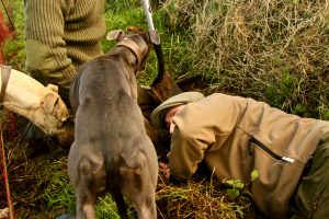 As the photographer clicked away the day soon started to darken, those winter days don’t last long and as all of you know will know as soon as it hits three o’clock or just after the daylight starts to go very quickly. By this stage we had worked the entire ditch up and down a few times and the ferrets had given their best. We wound up on the corner of the ditch with a ferret in a few feet with a rabbit stopped up, the first and only dig of the day surprisingly. It didn’t take long to get down and when we did I extracted the most unusual looking pair of rabbits I ever saw. They were a strange blue colour with very black eyes; I never saw anything like them before or since. As the light fell we took in the nets and gutted the rabbits and I put some food into each couple of ferrets in the boxes as they had a long day and had been travelling since the previous night. While we were packing up the farmer rang me and asked that I stop by for a “Debrief” as he called it and we swung by enroute to the motorway. “You get many”? He enquired. We had about three dozen in total and I thought it was a pretty good day. I opened my van and showed him the pile in the back. “Is that all? You will have to come back a day and try again”.