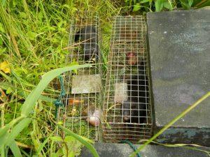 Another problem with cage trapping mink is human interference. Cages do not need to be covered in anyway if trapping in a secure location, but they do need to be hidden and disguised in some way if they are used in areas of public access. Hidden in bank-side vegetation, cages can be very hard to spot by members of the public who may not share your enthusiasm for pest control and they should remain undisturbed. The problem arises when they contain a very active and vociferous trapped mink. For this reason, frequent checks should be made of the cages, and always at first light before the public are up and about and any occupants humanely dispatched. As pest controllers we have a duty of care to any animal whilst it is under our control and unnecessary stress is to be avoided at all times. Take care when dealing with a trapped mink as they can strike with lightning speed and a carelessly placed finger can be an inviting target, as I once found out to my cost. When choosing a suitable cage for mink trapping, try and go for a larger and more robust type. I like the old double-entry Fenn cages as this makes it easy to place the bait behind the treadle. When placing bait inside the cage, it is sensible to wire it down and to make sure it sits well in from the edges. If the bait is touching the cage sides, a mink will often try and pull the bait from outside the cage instead of going in through the front door.