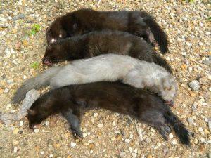 If for any reason you are unable to place your cages in the exact location you want, for instance, due to the steepness of a bank, or lack of vegetation, then place it as near as you can to the selected spot. You can, by dropping a few spots of rabbit blood, lead a mink up to the entrance of your cage from an area of frequent activity. You can also use a visual stimulant with the same effect, a few tufts of rabbit fur or some loose white pigeon feathers leading up to your cage will have the same result. If, after catching a few mink, you leave the cages un-cleaned and deliciously scented, this will greatly enhance your chances of future catches. On the subject of scent, do not store your mink cages anywhere near your rabbit cages for obvious reasons. No rabbit will ever enter a cage that smells of its mortal enemy. So there you have it, just a few tips and hints that may improve your success with mink cage trapping, and don’t forget to experiment a little with different baits and locations. I have told you some of the methods I use (and I know some people do things completely differently), but at the end of the day, if the results are exactly the same, that’s all that matters.