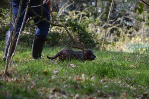 This Spring I have a young Teckel bitch to work on, she has completed most of what I had intended or her but now will require just a little more to get over the line. “Eyka” was bred from my German bitch “Cider” and sired by a brother to my other bitch “Poppy”. A smallish bitch who is very much her mother’s daughter with her nose always down and a busy keenness about her. She is looking like making a reasonable blood tracker and has completed quite a number of laid tracks and assisted in a live one over the winter. A likeable and easily managed little bitch, there is simply no fuss with her and even at only 5 or 6 months old she kept up with the others when we were raking about on Saturdays over the winter and got under fences, crossed drains climbed through cover without a problem.