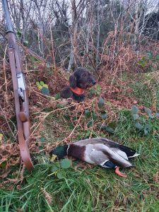 The Teckel is very much a multi-purpose dog, a sort of Hound / terrier but very much a unique breed and suitable for many tasks, although an individual dog rarely does it all they usually at excel at one or two things. Within the several that I keep some excel at tracking, some at working with the gun and fetching birds etc and others at simply flushing vermin to the gun or bolting it from an earth. My dog “Remy” imported from Germany from breeder Doreen Klaus, owner of the well-known “Vom Alten Friedrich” kennel in Dresden. Remy has really found his feet here and is a sure and steady blood tracker, but also has really taken to flushing vermin to the gun. He isn’t an overly large male, but powerfully built with a bay like a mastiff and stops for nothing when on a line and although he was a little more difficult to train, I have got him reasonably well done and he will happily, sit, stay, retrieve and has good recall for a Teckel. As he arrived as a young puppy in late October 2020, it would be the season gone before he really would see around him and really before he matured. We had a great season and he has established himself well. If it is coincidence I cant be sure, but on the many days we have been out either stalking a deer or just rousting about with a gun, he has flushed Woodcock, I have never had a Teckel before flush them except what appeared to be accidentally, although it seems that he can perhaps scent them but I cant be sure, but many times he has intentionally entered a piece of cover or some bushes and flushed one, it makes no difference to me as I am not a Woodcock shooter anyway, although I do enjoy when he finds them. Remy took to scent trails well, I was surprised as usually a Teckel that is busy and keen around cover has not got the patience to work out a blood trail he however does and we did many trails together in the spring of 2021, working quickly up to 1000 metres laid 24hrs before, which is not bad going. However, this all changed after his first encounter with a fallow pricket over the winter and he has absolutely zero interest in laid trails which is something that just happens.