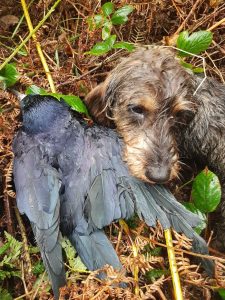 Of course, easily spotted pheasants and Ducks landing in open fields is all very well, but when it comes to the thick cover and necessity to actually go out and find something you didn’t see falling or in fact something falling in the black dark on a wet night it takes a different dog. A Labrador, Spaniel or something similar would be ideal – Except I had a Teckel. This too happened by accident. I was exercising Oscar one evening along the river and had the gun when ducks began to drop in as the light fell. I was sure there would be a few more and rather than walk him back to the van and then return to shoot I made my way to the ditch, got banked in and set him on my knee. Within less than a minute two mallard crossed and we folded one. After another few minutes he had another and sat another perhaps 15 minutes and saw nothing else. I knew the second bird landed on the flat field out in front but the first was somewhere behind me. I walked off in the dark for a look and Oscar ran ahead. With a head lamp I squinted round roughly where I though it had landed but to no avail. After a few minutes there was no sign of my young German aside from a bit of snuffling and snorting in a hedge close by. I climbed under, shone the torch and found him attempting to drag a large Mallard Drake from some blackthorn! This was to be the beginning of a new shooting partnership! The next I shot a Rook overhead, and again it fell well into some Ferns that had died back. I could see the bird but didn’t show him and he rummaged and searched about until he found it but just like his kennel mate Fudge, made no attempt to lift it.