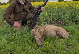 The sun was almost liquid…rolling across the grass, the plough and the Rapeseed. It was warm but a slight evening chill had begun to take hold and the sky was completely blue. As I admired my surroundings and tried my best to soak it all up, a Roe Buck appeared from the Rapeseed and stepped onto the plough. He was in no hurry or any general direction, just walking here and turning back there and sort of roaming around very nonchalantly. I watched him through my binoculars closely and he was coming my direction, increasing his speed a little I reached over and put my hand on the rifle and slowly brought it towards me.
